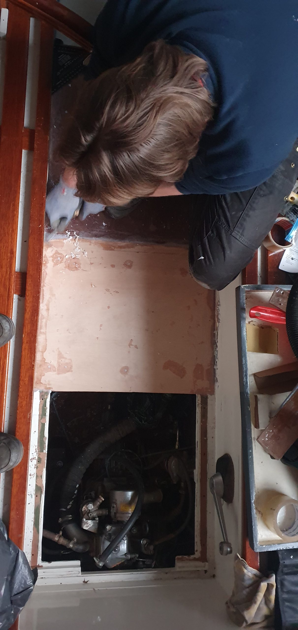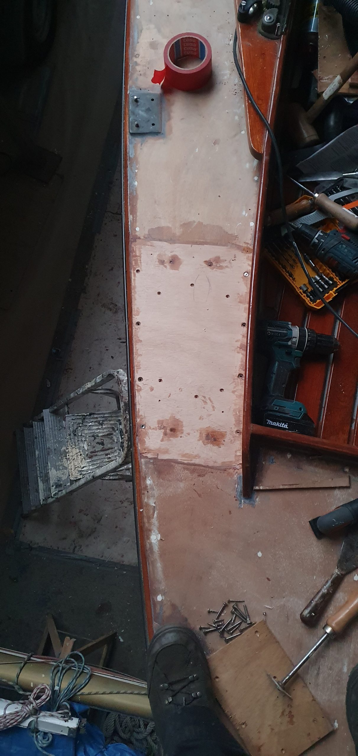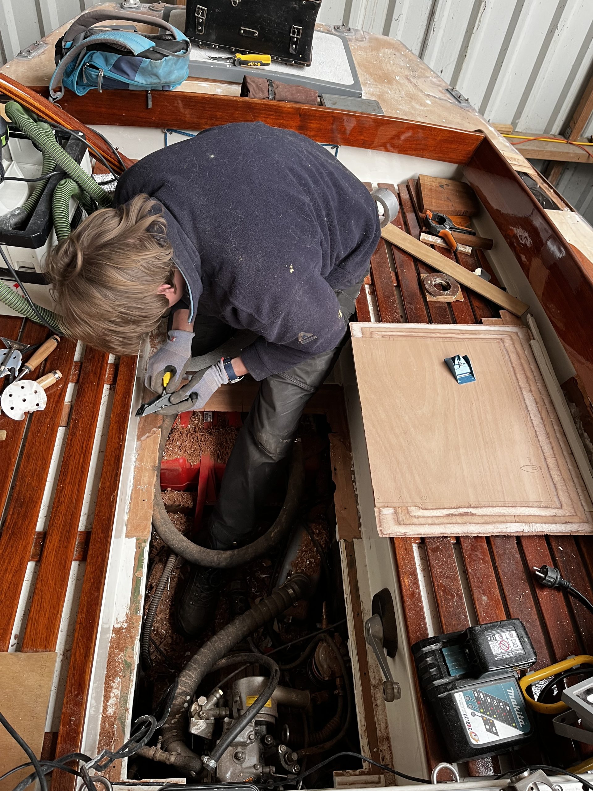 Dus zo gezegd, zo gedaan: Ik het dek, Jorik het motorluik. Het bestaande gat moest dus verkleind worden. Hiervoor hebben we de oorspronkelijke balkjes waar de kuipvloer op lag, teruggebracht en met de houtlas techniek de kluipvloer tot juiste lengte verlengt. We plaatsten nieuwe balkjes rond het luik en ook hier werkten we oudere reparaties en slordigheden netjes weg. Zo netjes als dat we hetzelf zouden hebben gedaan.
