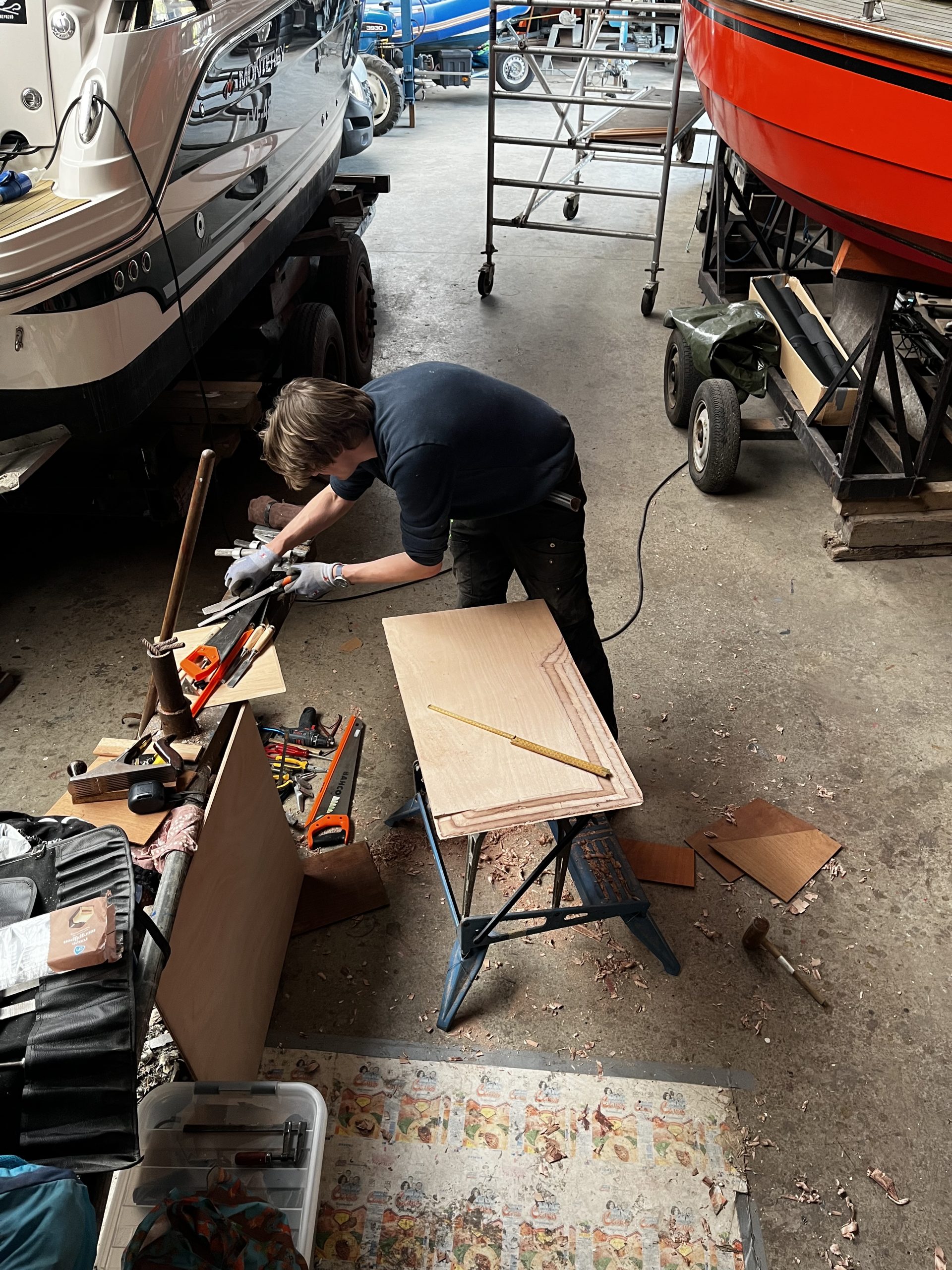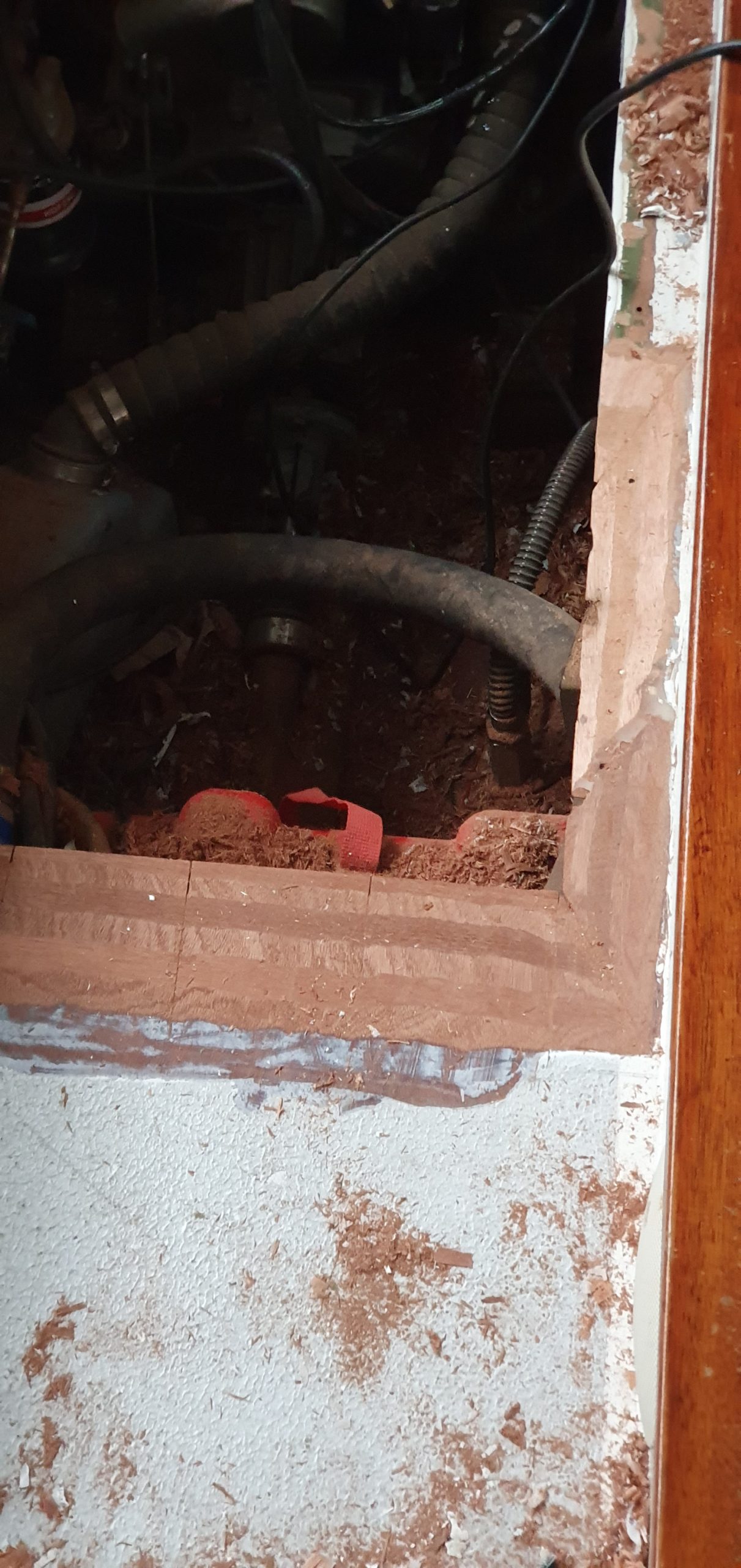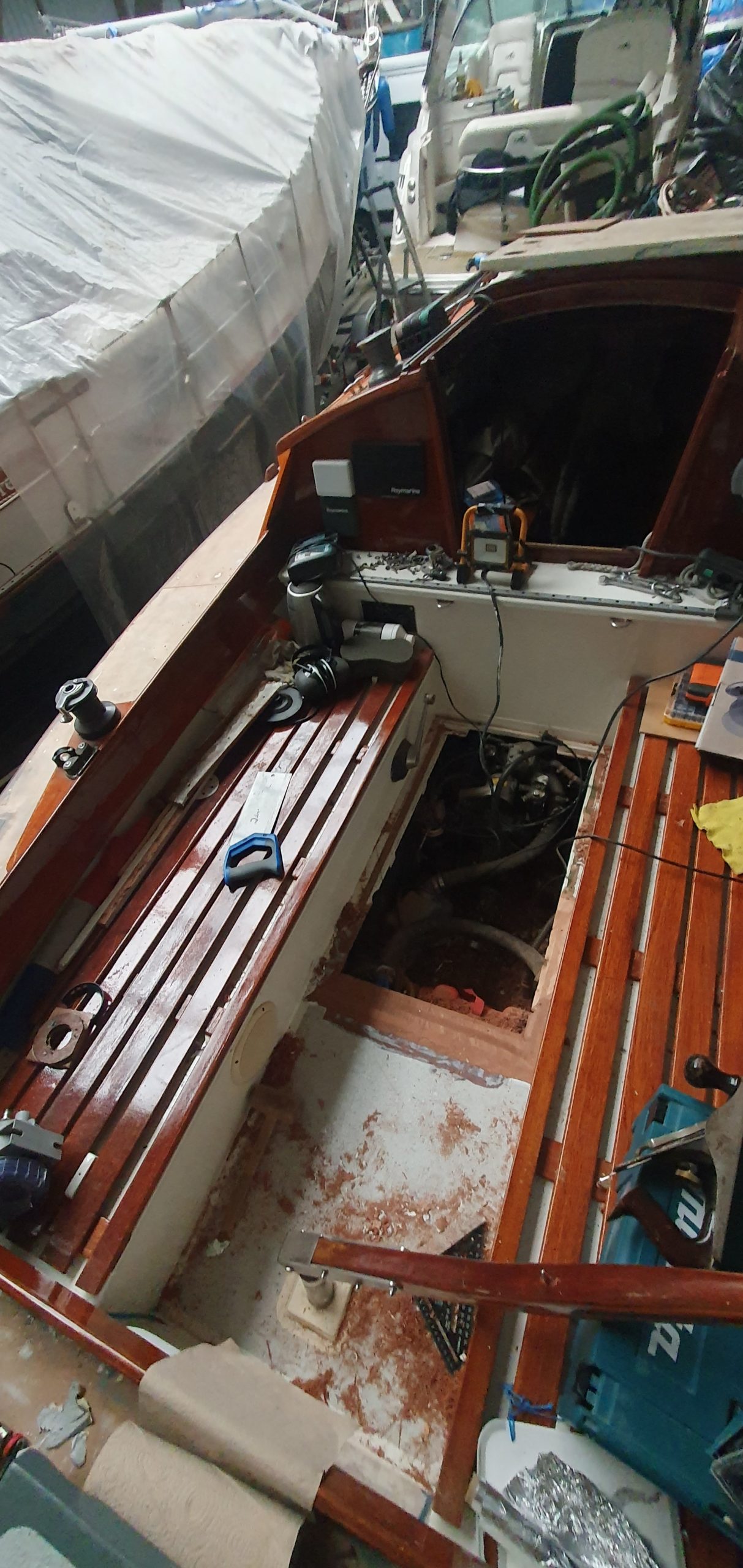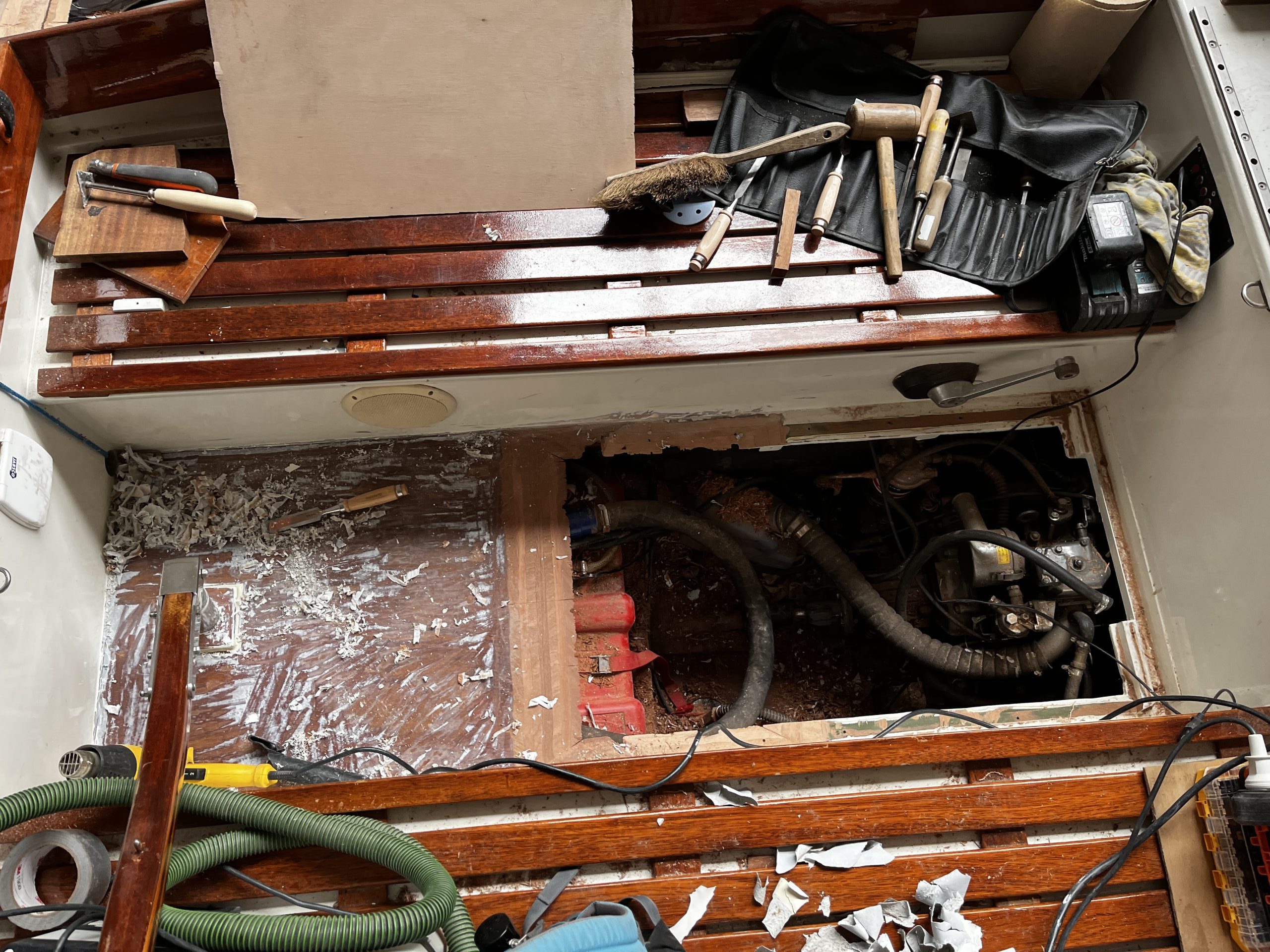 Dus zo gezegd, zo gedaan: Ik het dek, Jorik het motorluik. Het bestaande gat moest dus verkleind worden. Hiervoor hebben we de oorspronkelijke balkjes waar de kuipvloer op lag, teruggebracht en met de houtlas techniek de kluipvloer tot juiste lengte verlengt. We plaatsten nieuwe balkjes rond het luik en ook hier werkten we oudere reparaties en slordigheden netjes weg. Zo netjes als dat we hetzelf zouden hebben gedaan.