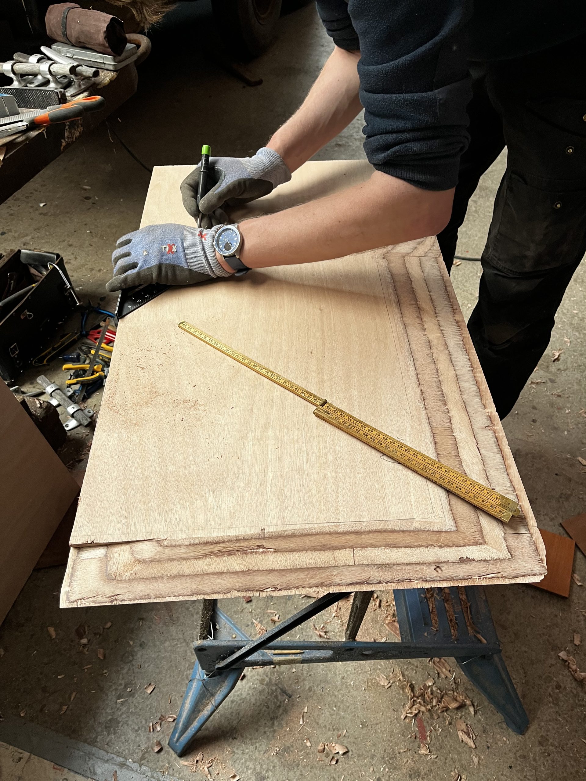 Jorik heeft aan beide kanten van het luik een verhoging aangebracht. Omdat bij het eruit halen van het oude luik, deze altijd onhandig langs de gashandle gemanouvreerd moest worden, maakten we het nieuwe luik iets smaller. Met als consequentie dat er aan beide kanten een spleet ontstond van een paar centimeter. Dit leek ons erg onpraktisch en hebben we dus met balkjes opgelost.