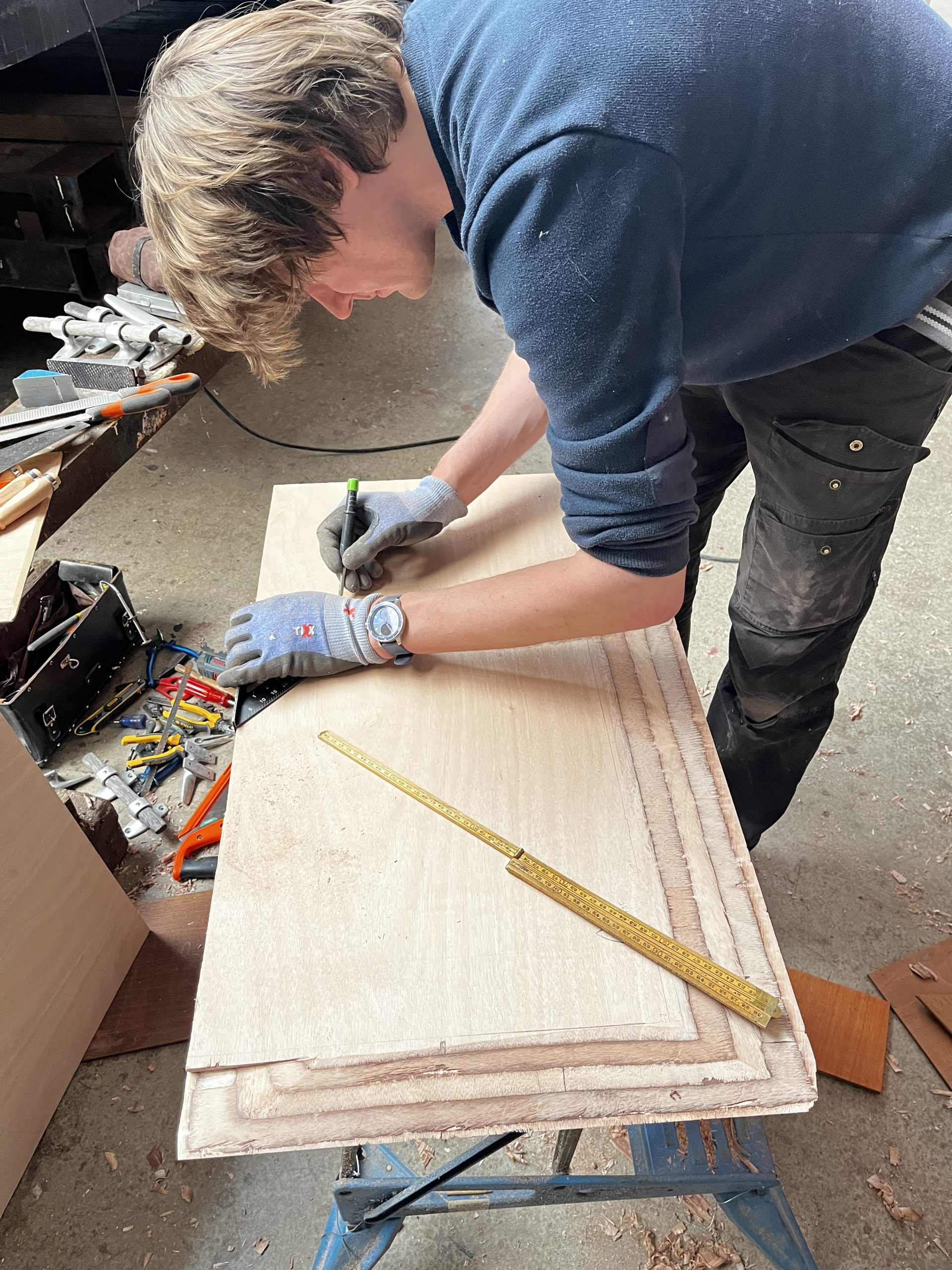 Aan de voorkant van het luik zaten twee L profielen op elkaar geschroeft tot een u-profiel, omdat hier geen plek meer was voor een houten opstaande rand. Wij hebben hiervoor bij de metaalwinkel een op maat gemaakt U profiel met onze maten laten buigen zodat het precies zou passen zoals we wilden. Jorik heeft vervolgens het U-profiel verzonken in de vertikale plaat waarachter de kajuit zich bevindt.