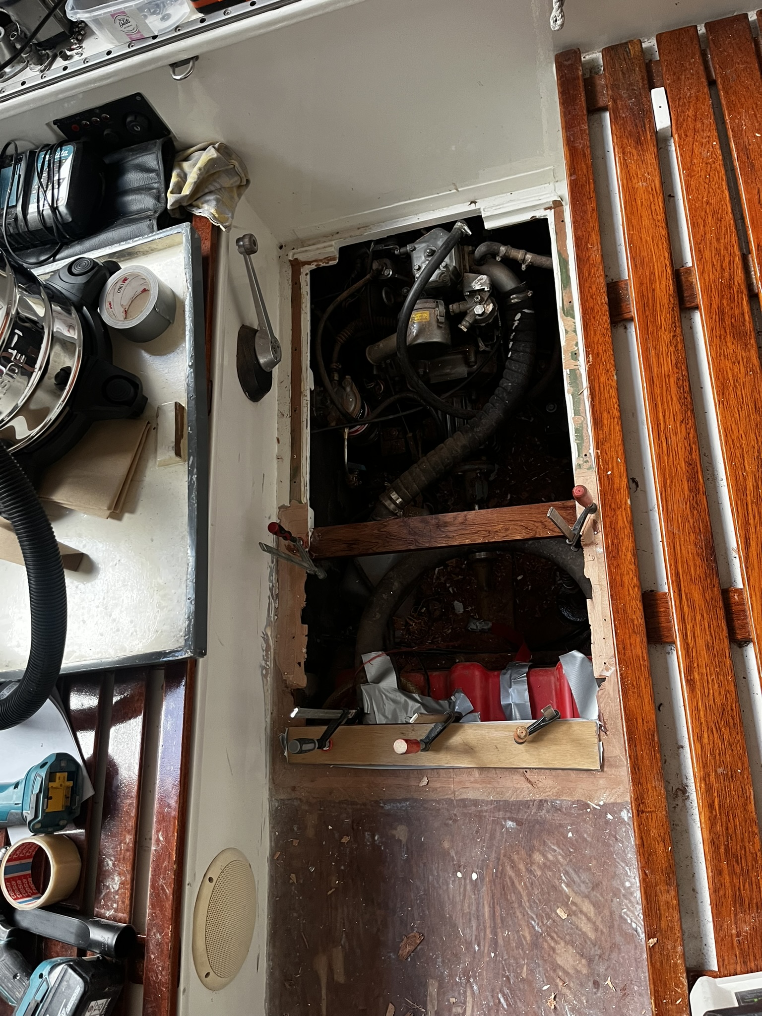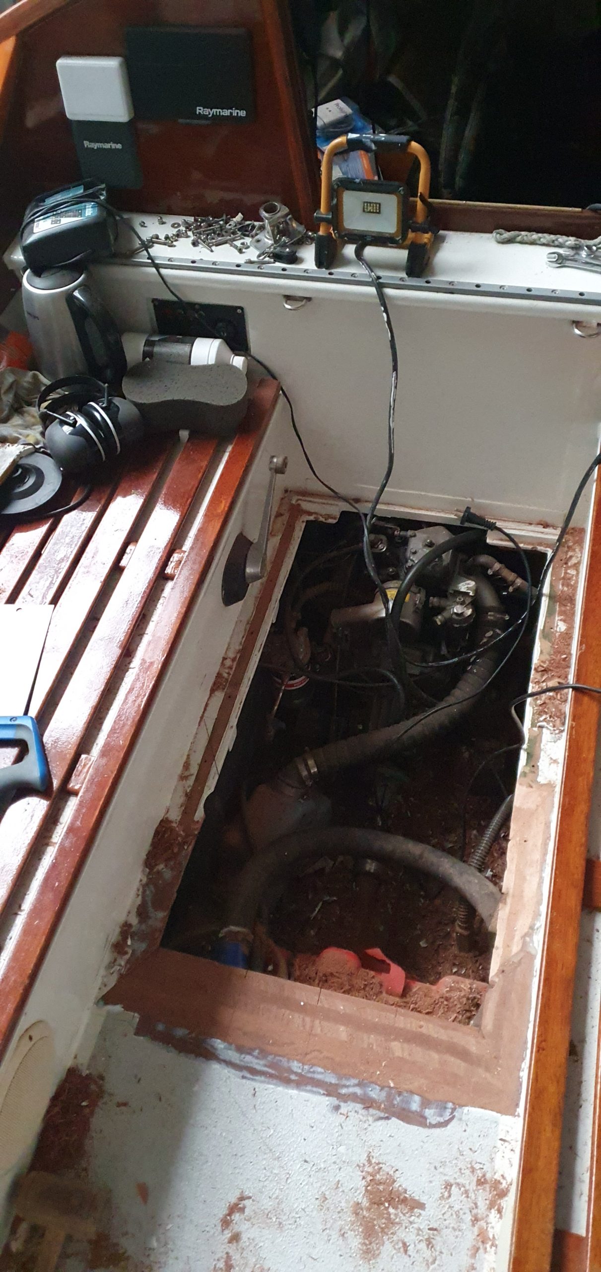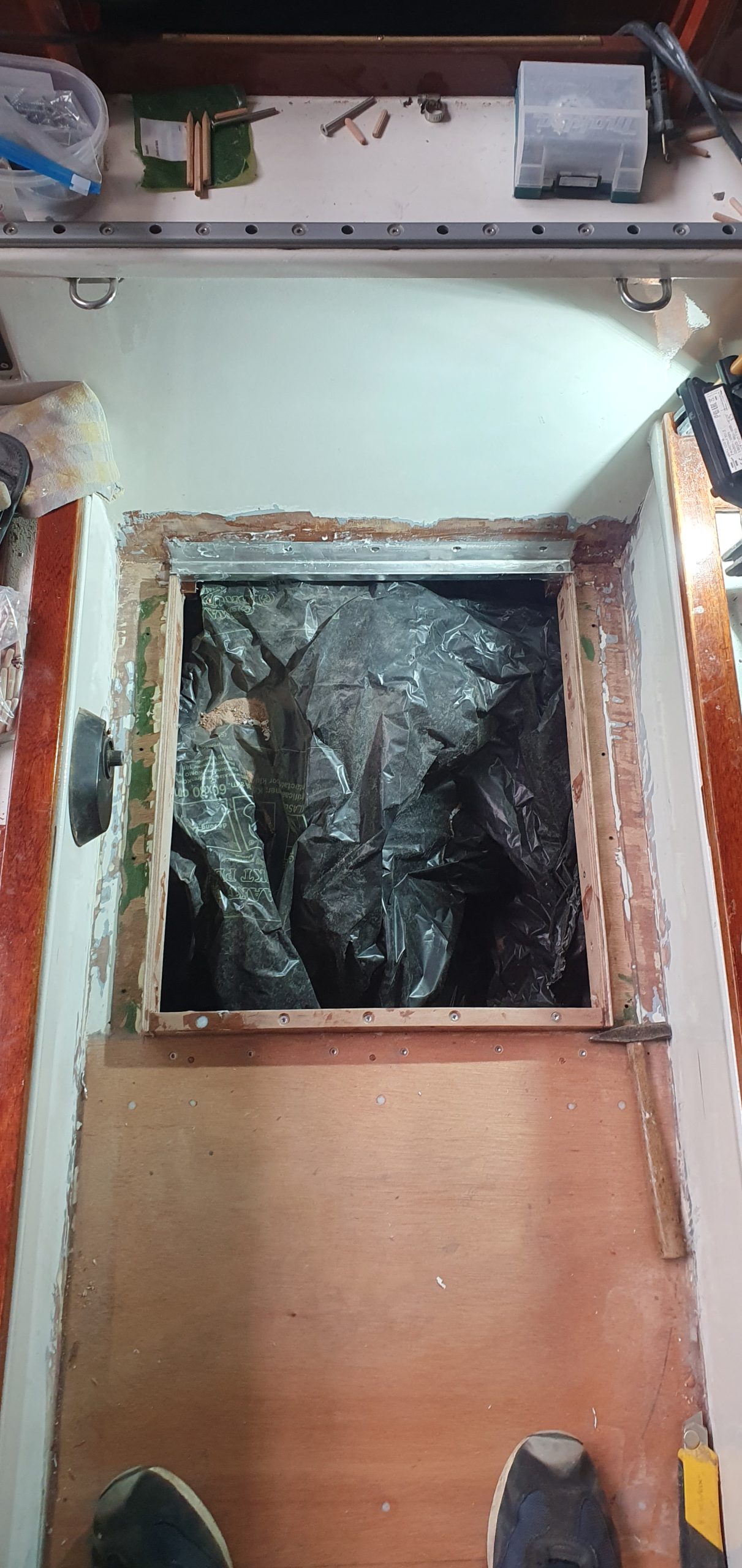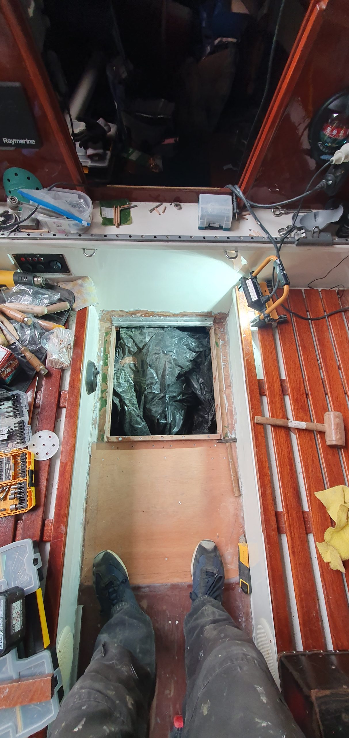 Een andere klus die gedaan moest worden, was het vervangen van het bestaande motorluik. Dat hing nog uit gewoonte aan elkaar. In het verleden heb ik dat improvisorisch en snel met epoxy gerepareerd, maar nu ik het dek kaal haalde, vond ik dat op z’n minst het luik ook kaal moest halen. Het dek ging kaal om twee redenen: ik was helemaal klaar met de gladde kiwigrip en ik had het dek nog niet eerder echt kaal gehad, in tegenstelling tot de rest van het scheepje.