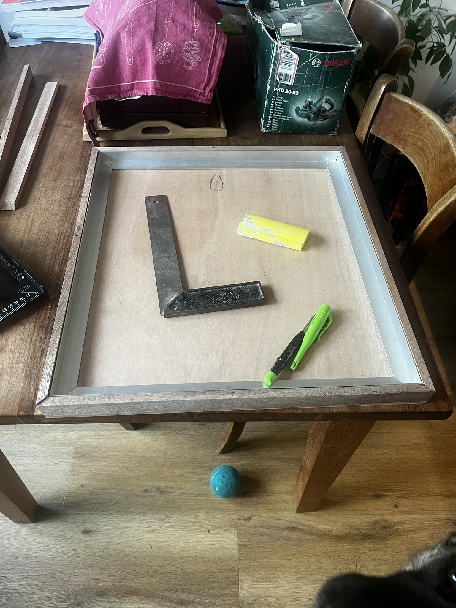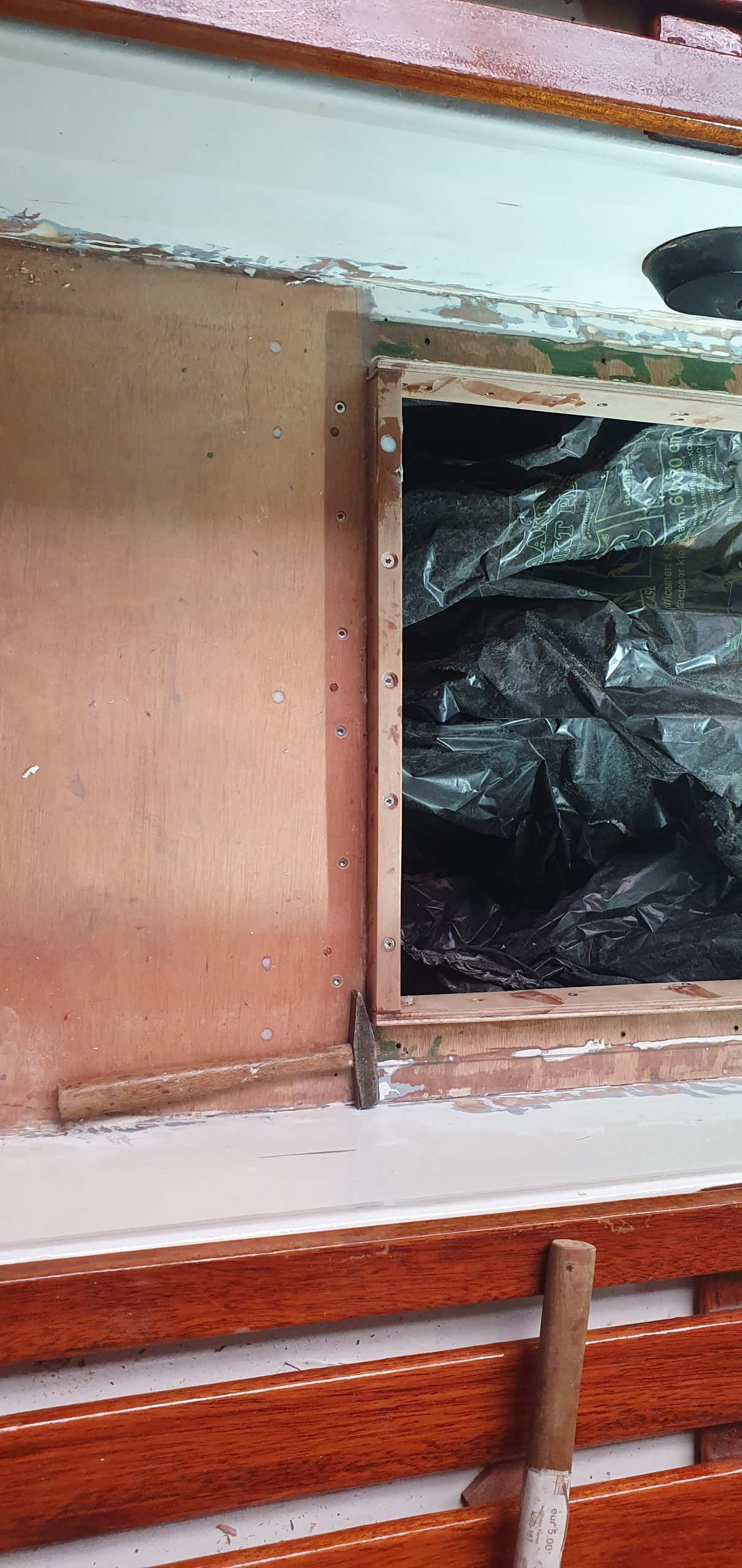 Het nieuwe luik is helemaal recht, aan de binnenkant verstevigd met aluminiumstrips. Deels door mijn twijfels ingegeven omdat we de randen van het nieuwe luik, niet van harthouten balkjes, maar gewoon van 10mm dik multiplex hebben gemaakt. Omdat het in z’n geheel in de epoxy staat, denken we dat dit voor het hout niet moet uitmaken qua watervastheid. Wel had ik mijn twijfels over de dikte, vandaar de versteving met alustrips.