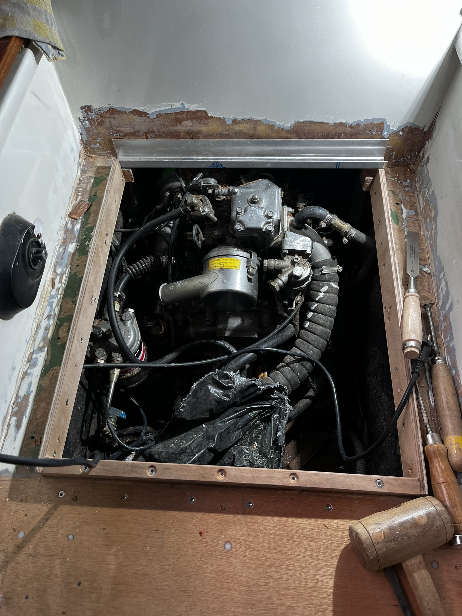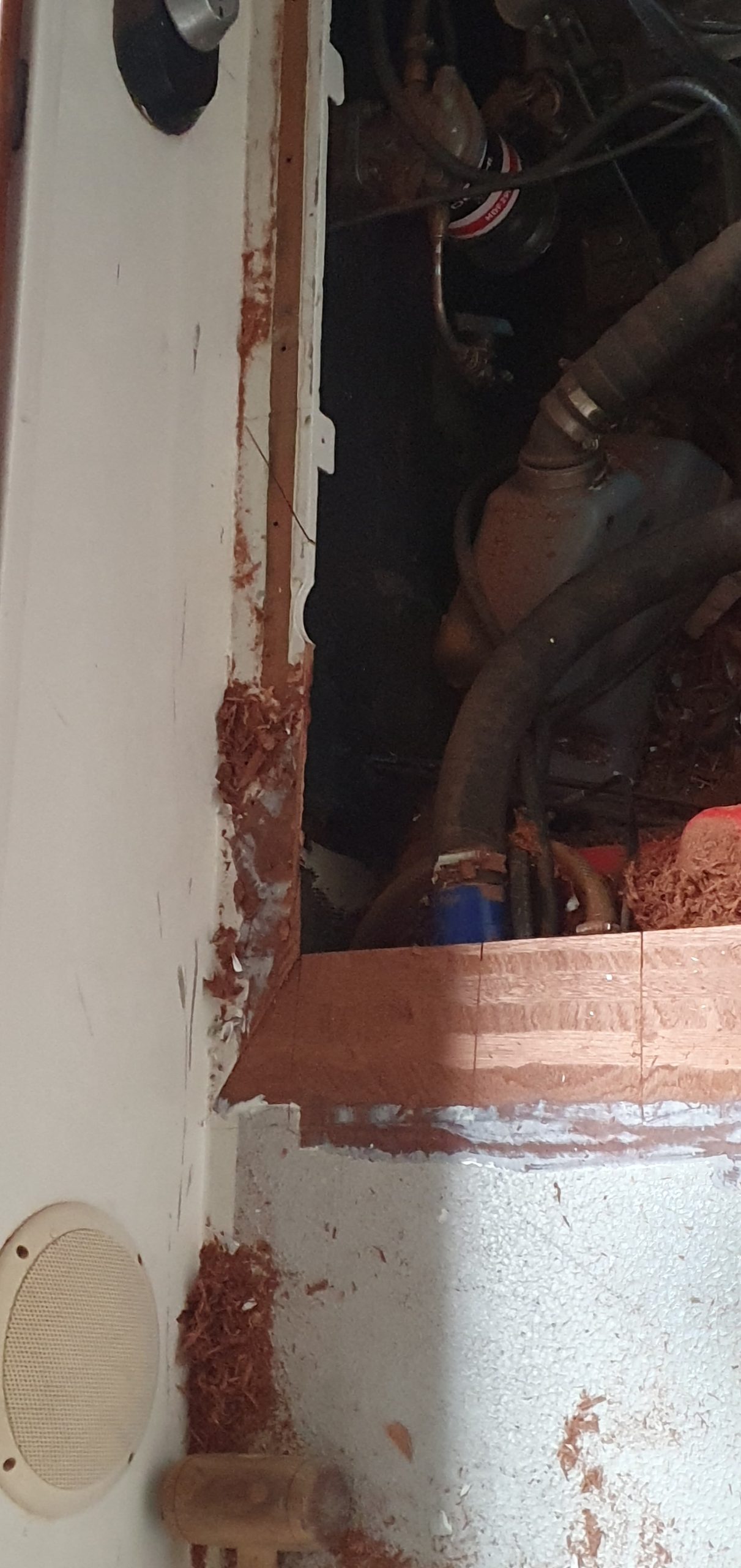 Goed, het motorluik dus. Toen ik het scheepje kocht, lagen er twee luiken in de kuip, het andere luik had ik al eerder laten verdwijnen omdat luiken toch een zwakke plek zijn. Het over gebleven luik ligt over de motor heen en besloeg ongeveer de helft van de kuip. Omdat we besloten toch een nieuw luik te maken, waarom dan niet gelijk het luik een stuk kleiner maken, zo houdt je meer beenruimte in de rest van de kuip over.
