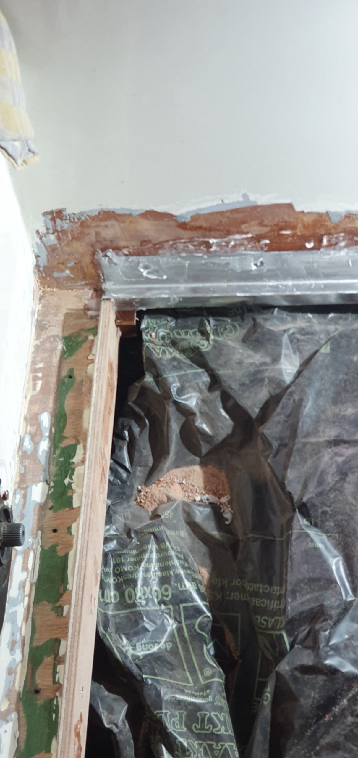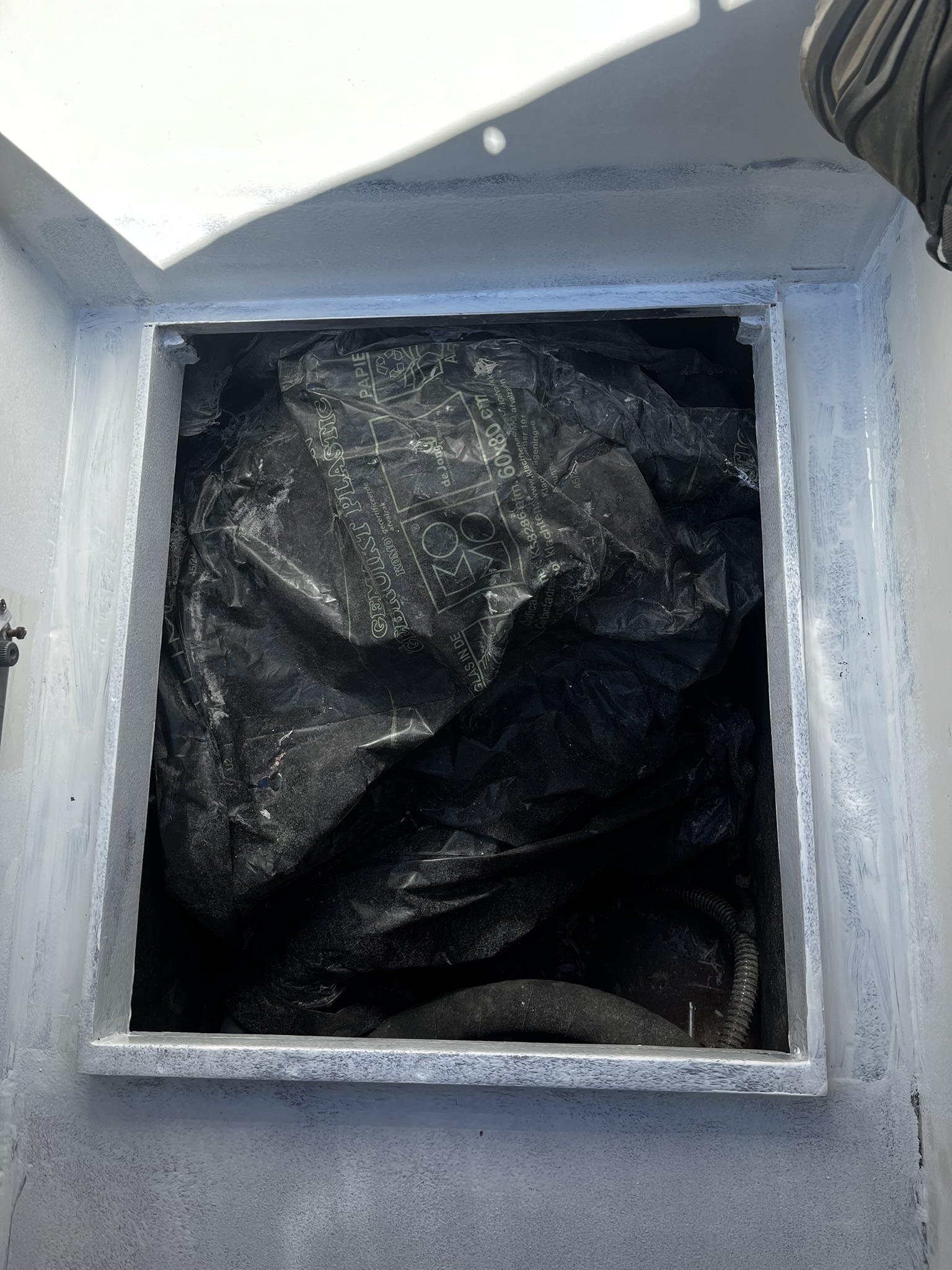 Het oude luik was aan de binnenkant geisoleerd met schuim. Voor het nieuwe luik hebben we een geluidsdempende plaat gehaald. Maar die hebben we er nog niet ingeplakt.